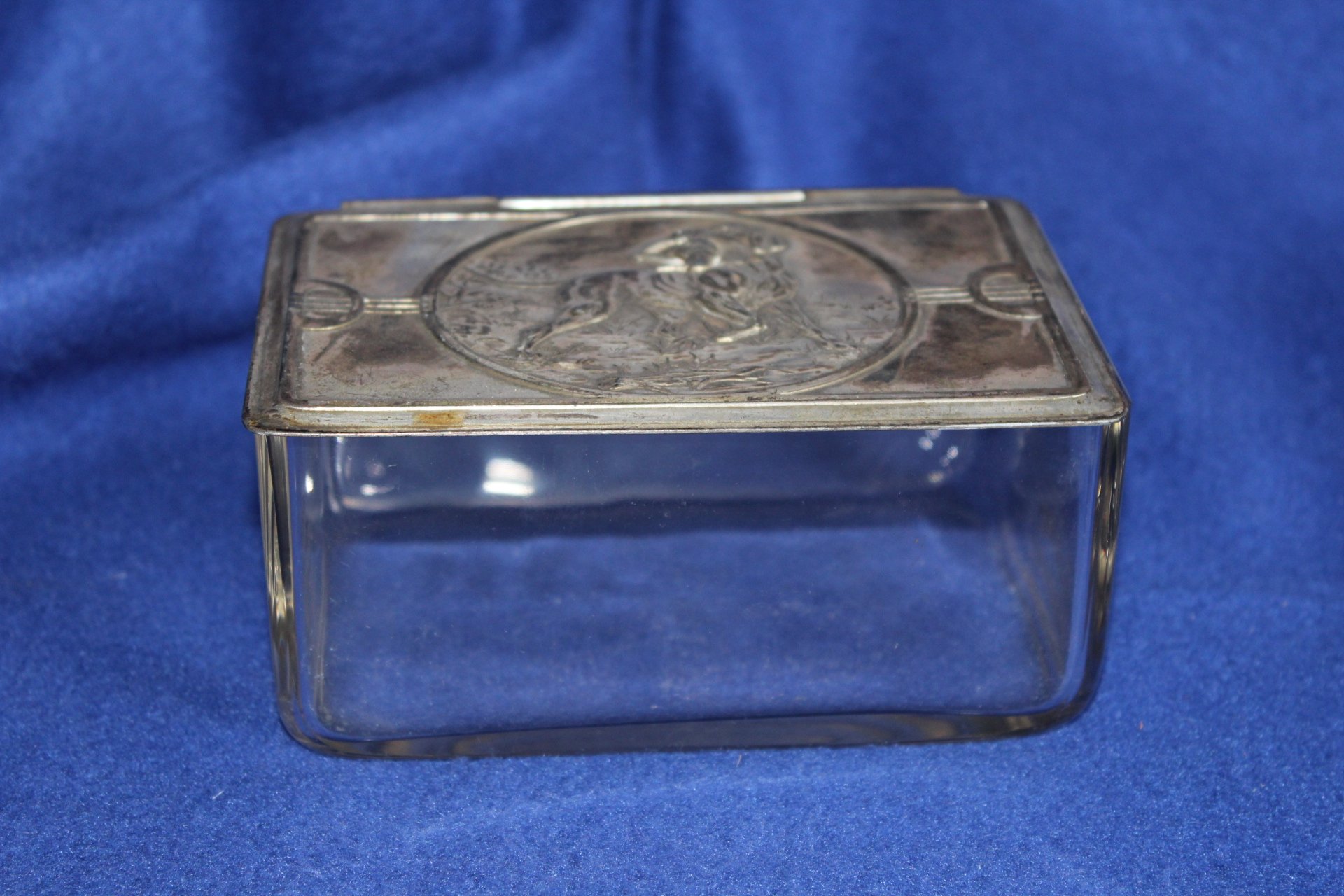 Krásná dóza s kovovou montáží, má lovecký motiv psa při honitbě. Je v krásném stavu.