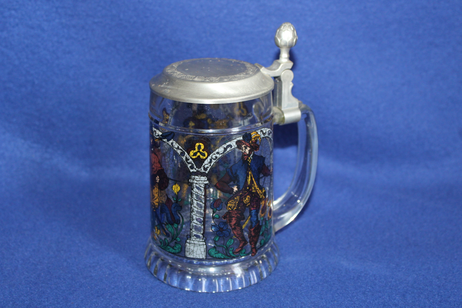 Starý korbel s víčkem, krásně zdobený, ručně malovaný, 18 cm výška.