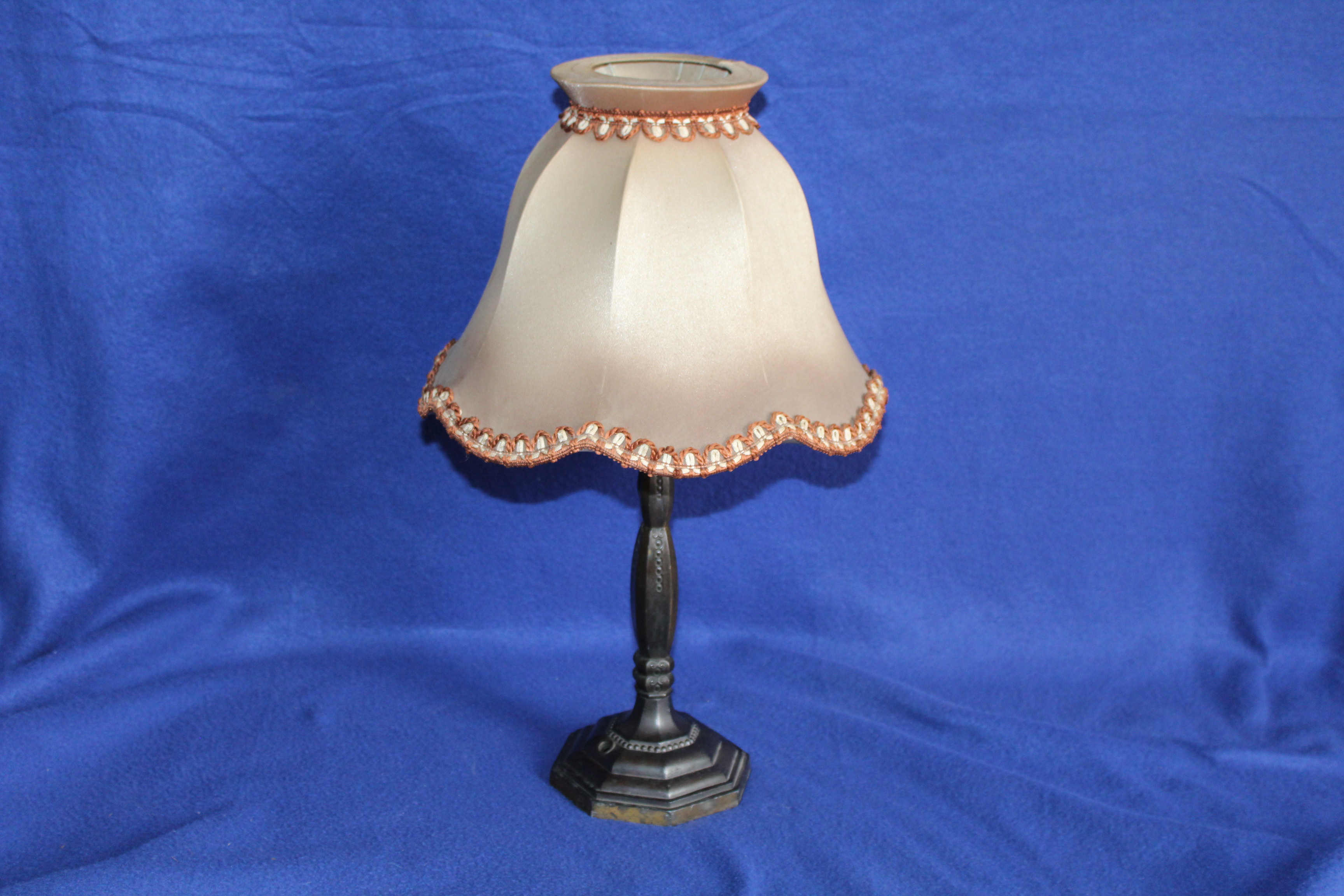 Krásná stará lampa, má mosaznou základnu, plátěné stínidlo, elektrika chybí, 50 cm výška.