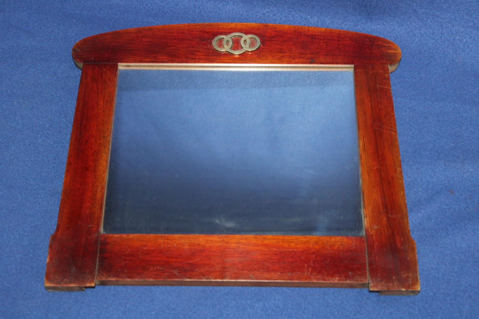 Malé secesní zrcadlo s mosaznou montáží. Pěkný stav, 37 x 33 cm.