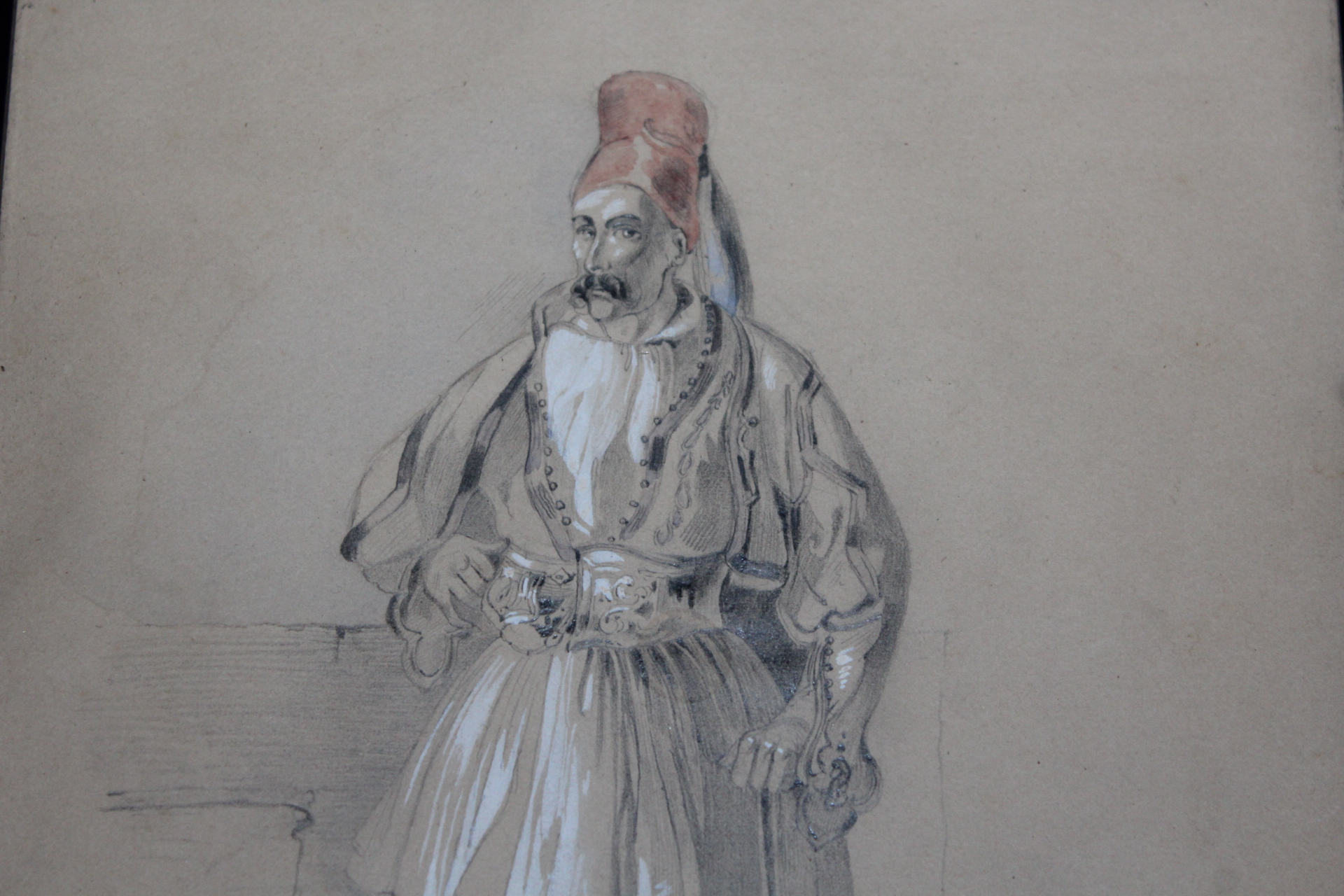 Stará kolorovaná kresba na kartonu, sig. viz foto, rám 30 x 20 cm.
