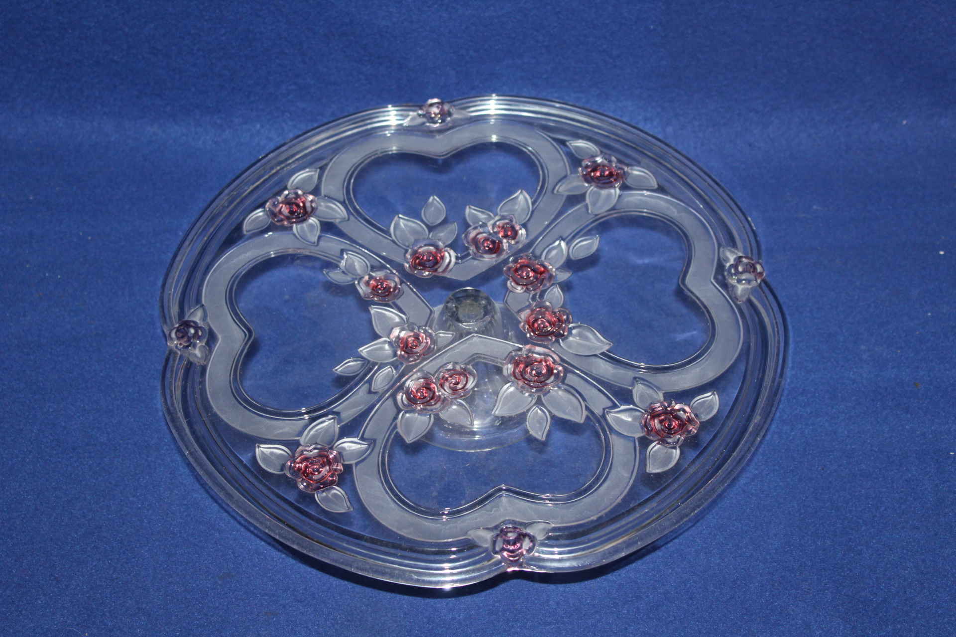 Starý skleněný nástolec s motivem růží. Je v krásném stavu, 34 cm průměr, 6 cm výška.