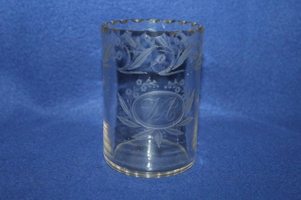 Starožitná sklenice s monogramem, krásný stav, 11 cm výška.