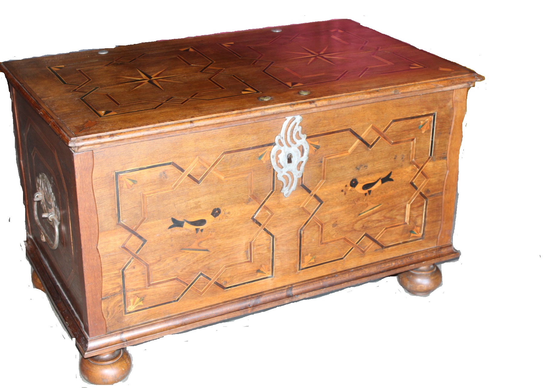 Starožitná truhla v nádherném stavu. Je bohatě intarzovaná, má původní masivní zámek s klíčem (neodemyká se). Pevná, čista, vhodná k používání.