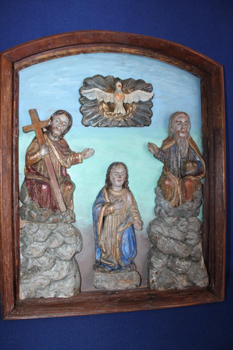 Starožitné lidové řezby zasazené do dobového rámu. Vysoká umělecká práce. Ručně vyřezávano, krásný stav.