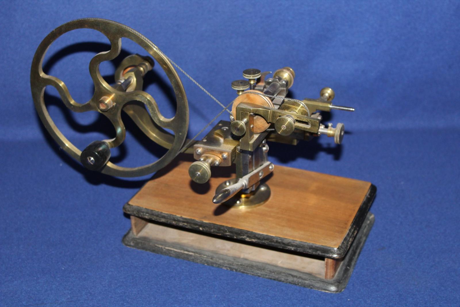 Starožitný přístroj asi nějaká hodinářská frézka, funkční (pouze laický pohled), masivní mosazný kus.