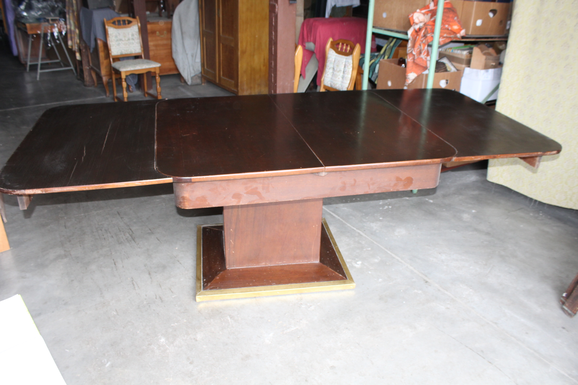 Velký rozkládací stůl s centrální nohou s mosaznou lištou. Je pevný, vhodný k používání, čistý, má pouze běžné opotřebení.